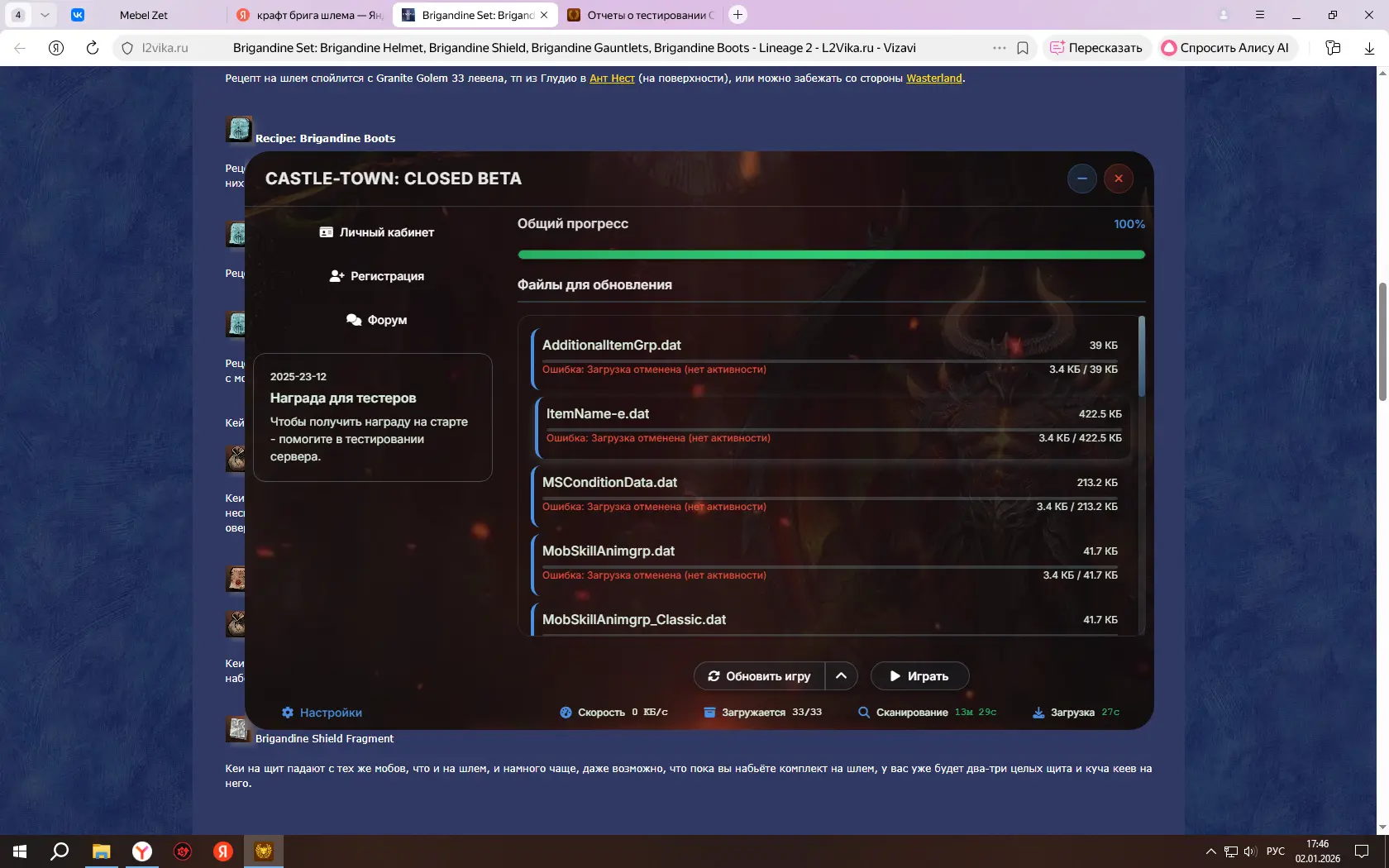 обновляю через Лаунчер,ошибку выдает в проверке файлов,после захожу в игру и на выборе сервера дает Крит...